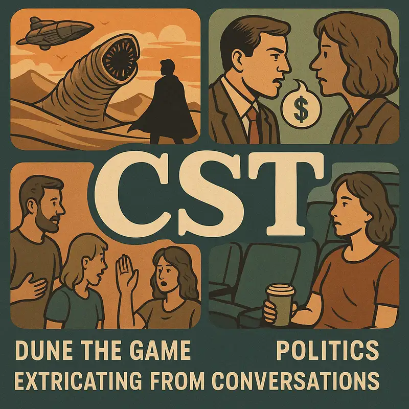 * Dune the game* Politics is in everything* Extricating yourself from conversations* Doing stuff alone
